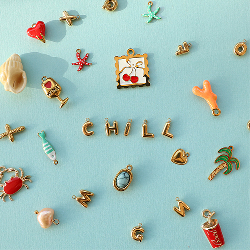 Looking for playful, colourful charms for new necklaces? This new collection of stainless steel enamel charms features different shapes such as lemon, cherry, heart and fish, complemented by gold balloon-style letters. Discover the new collection in the shop!