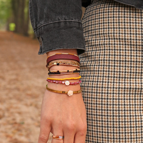 Create great jewellery sets by combining different kinds of beads with each other. For this autumn set we have used Miyuki beads, seed beads, top faceted beads and shell beads. A combination of these beads can easily be threaded onto elastic cord. Make sure you use colours that match each other nicely. Don't forget to use belcher chain or stainless steel beads. You can make a matching long necklace out of belcher chain and decorate it with seed beads, using the daisy chain technique.