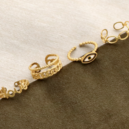 Create small rings using beads to wear together with this collection of stainless steel rings. Use elastic cord and string different kinds of beads, like Miyuki beads, freshwater pearls, faceted beads and stainless steel beads. You can also make a ring with a belcher chain. String three top faceted beads onto an eyepin, cut it on the right size and make a second loop. Fix a belcher chain to the two sides to finish your ring. Wear this ring with a matching belcher chain bracelet.